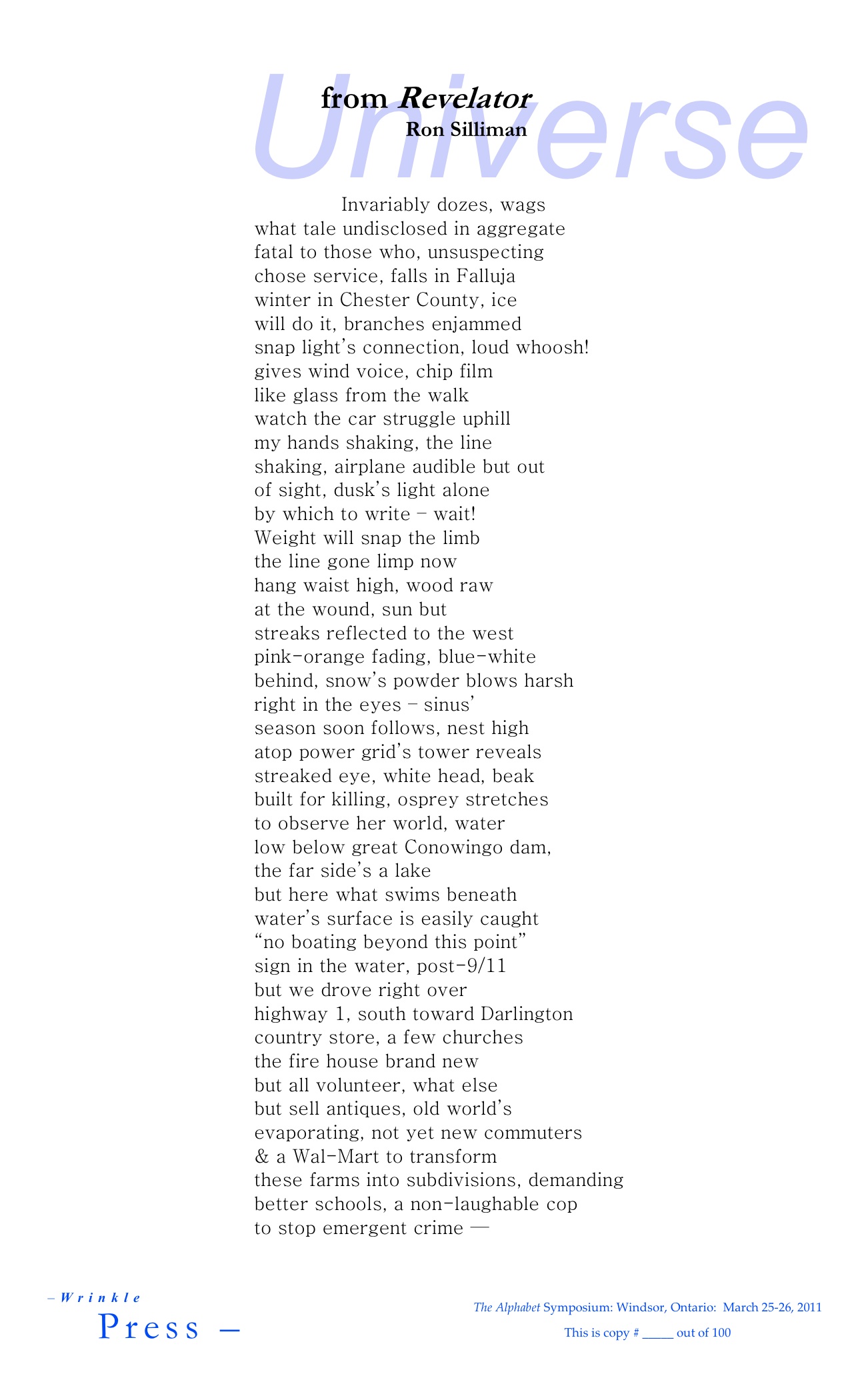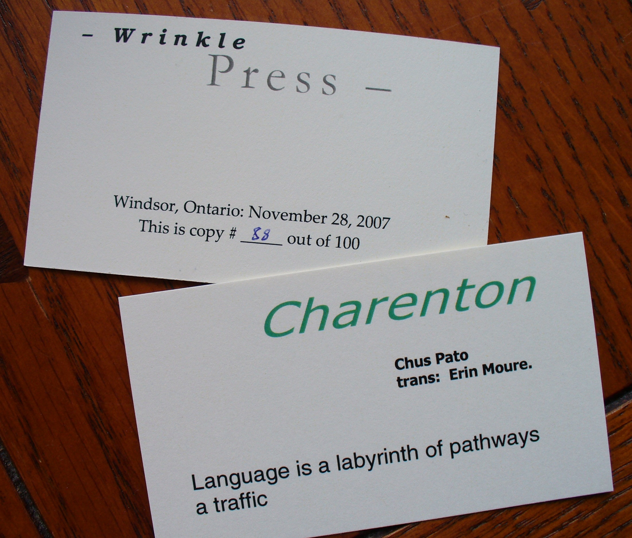 Wrinkle Press publishes Canadian poetry chapbooks — by invitation — and includes a range of styles, interests, experiments, and disjunctive investigations. Wrinkle foregrounds the material and the visual, publication as art that complements and embodies the poetry.